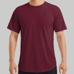 100% polyester heathered wicking knit ; Wicks moisture away from the body ; Pad print label ; Self-fabric crewneck collar; Set-in sleeves ; Double-needle hemmed bottom and sleeve.;