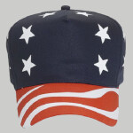 100% Cotton Unstructured Soft Crown Low-Fitting 6-panel cap Seamed Front Panel with Full Buckram 6 Sewn Eyelets Sewn Star Design on Visor Pro Stitch on Crown Matching Fabric Undervisor U.S. Flag Woven Tag on Closure Adjustable Hook & Loop Closure