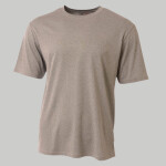 100% polyester heather tee, 4.2 oz. per square yard; Odor resistant and stain release fabric for easy care; Moisture management for all season comfort; Neck seam cover-stitched for extra durability; Tag-free neck;